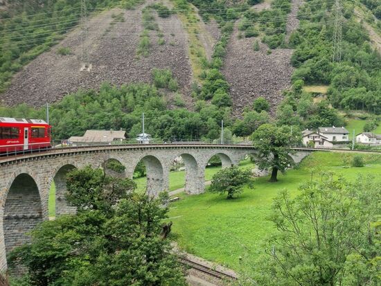 Als weitere Besonderheit kommt bald der Kreisviadukt von Brusio in Sicht, wo die Bahn wegen des Höhenunterschieds eine Schleife fahren muss. Wie man sieht, sind an die normale Regionalbahn bei schönem Wetter offene Aussichtswagen angehängt. In den übrigen Wagen lassen sich (oft) die Fenster für ein schöneres Foto öffnen.