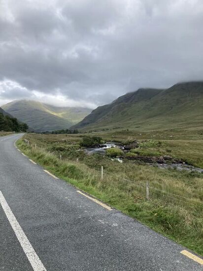 Nach dieser Pause folgt der letzte Abschnitt bis Westport am heute wolkenverhangenen Croagh Patrick vorbei. Auf den letzten Kilometern gibt es sogar einen Radweg. Die Akkus der Räder sind fast aufgebraucht, da gibt es doch tatsächlich noch einen starken Anstieg innerhalb des Ortes zu unserem Hotel!
