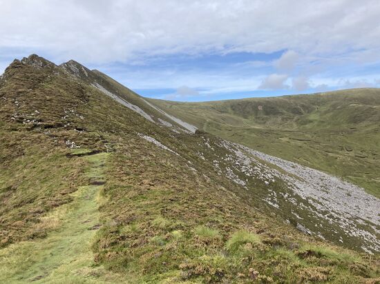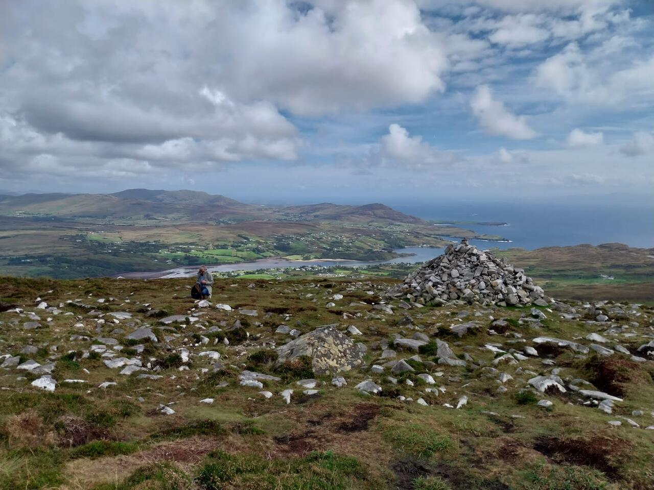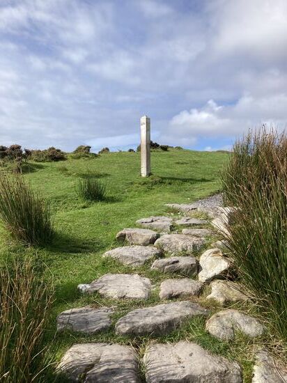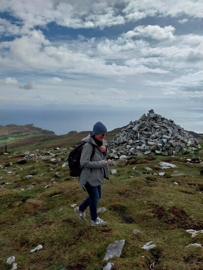 In der Entfernung sieht man Personen oberhalb der Felsen wandern. Es gibt einen Pilgerweg dort oben, den wir als Rundweg zurück zur Bushaltestelle nach Carrick laufen könnten. Denn vom Ort Carrick bis hier mussten wir die ganze Zeit an der Straße gehen, was wir uns für den Rückweg ersparen wollen.