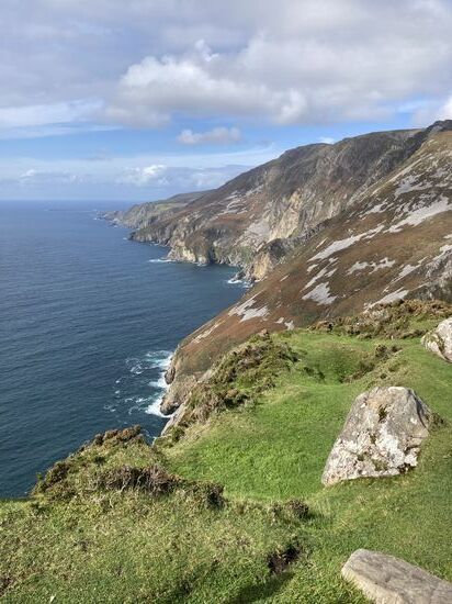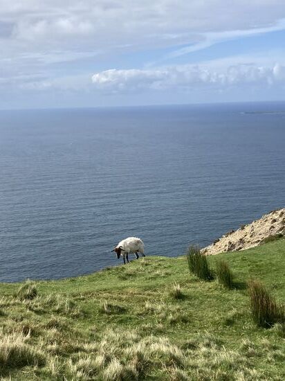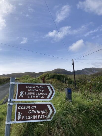 Zu Fuß wandern wir von dort bis Teelin, weiter zum Visitor Centre und schließlich zum Bunglass Ausblick. Dort verweilen wir mit vielen anderen Touristen und staunen über die gewaltigen, 601 m hohen Felsen. Bei dieser Aussicht schmeckt das mitgebrachte Essen besonders gut.