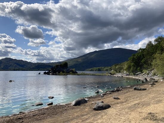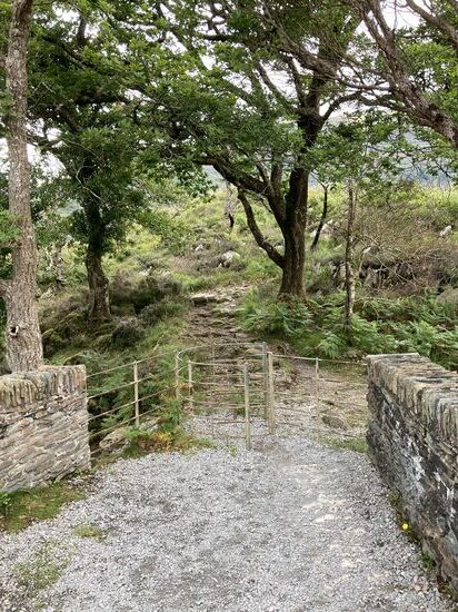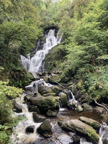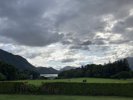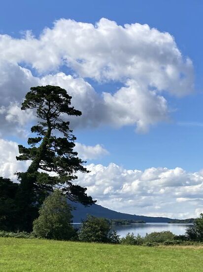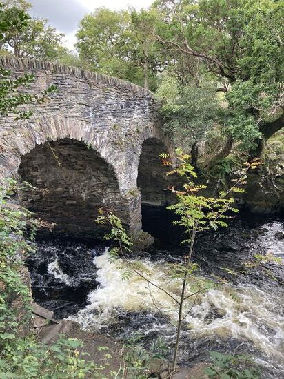 Ab Mittag leihen wir uns Räder und fahren in den Nationalpark. Die Radtour führt zum Muckross House, um den Middle Lake mit den Highlights Old Weir Bridge, Dinis Cottage, Torc Waterfall. Der Radweg ist prima: Kurvenreich, neu geteert und. mit vielen wunderschönen Ausblicken auf den See. Auch beim radeln müssen wir uns immer wieder an das Fahren auf der linken Seite erinnern. Es ist Samstag und viele Ausflügler sind unterwegs.
