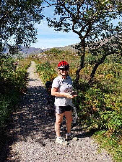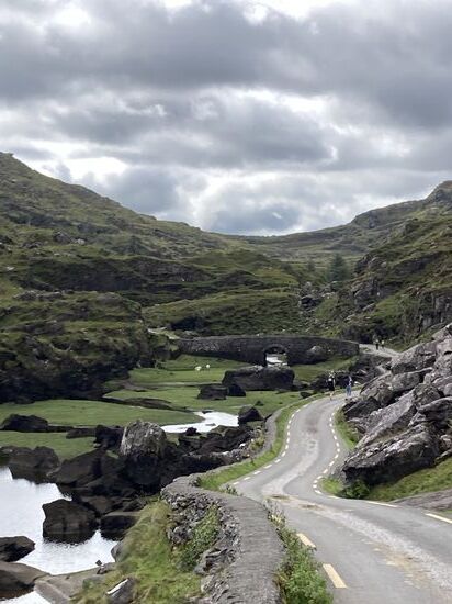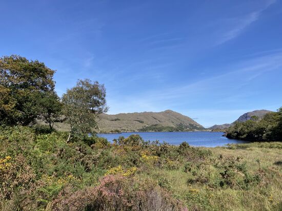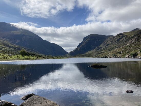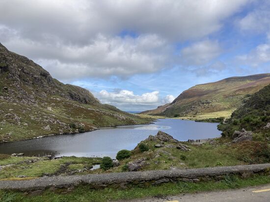 Die Fahrt geht abwärts, die Bremsen haben viel zu tun! Durch ein dünn besiedeltes Tal, das an vielen Stellen in den Farben grün, lila (Heide), gelb (Ginster?) blüht. Dazwischen immer wieder Seen. Im Black Valley fahren wir bis zum Lord Brandon Cottage. Unser mitgebrachtes Picknick genießen wir am Fluß auf einer steinigen Sandbank in der warmen Sonne. Es herrscht T-Shirt und kurze Hosen Wetter. Herrlich!