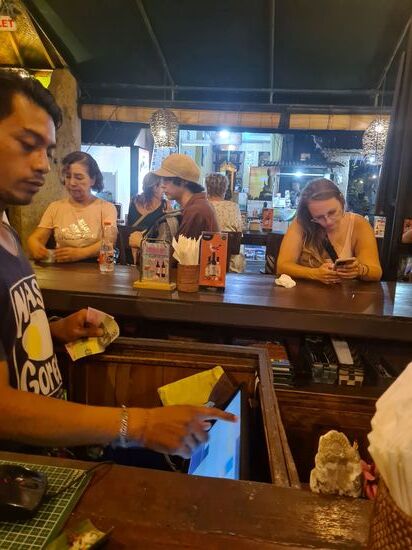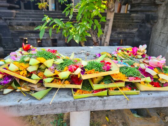 Kleine, aus Gräsern kunstvoll gestaltete Schächtelchen, die gefüllt sind mit Allerlei. Blüten, Reis, manchmal Zigaretten und Räucherstäbchen.
