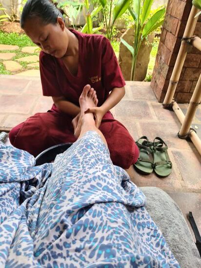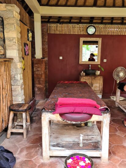 Dann gibt es eine Ganzkörpermassage, von oben und unten, vorwärts und rückwärts. Anschließend ein Bodypeeling und eine ölbehandlung..