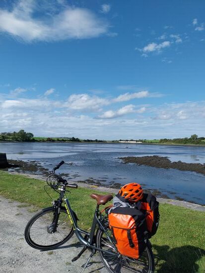Nach einem gutem Frühstück im Hostel (103 Euro Übernachtung mit Breakfast für uns zwei) waren wir froh der Enge dort zu entgehen. Mit Gepäck ging es mit dem Stadtbus (2€) zum Fahrradverleih. Dort beim West Cycles Hire bekamen wir E- bikes und konnten unser Gepäck in Packtaschen umpacken ( alles zusammen für 200€ die Woche). Nach kurzer Einführung und Satteleinstellung bekamen wir noch einen Helm und eine Karte (leider vom Massstab unbrauchbar, wie sich schnell herausstellte). Nach kurzem Stop im Supermarkt freute ich mich nun besonders auf die frische Luft und Freiheit beim Fahrradfahren. Vorerst mussten wir aber erstmal aus Galway herausfinden. Wir fuhren im Linksverkehr auf sehr befahrenen Straßen, die nur abschnittsweise mit Fahrradwegen ausgestattet worden sind. Volle Konzentration war gefordert und wir mussten auch nachfragen, um den Weg zu finden. Irgendwann landeten wir auf der richtigen Ausfahrtstrasse und wie durch ein Wunder tauchte plötzlich das erste Fahrradroutenschild vom West Atlantic Coast Way auf, mit der Nr. 1. Nun konnten wir dieser Beschilderung gut folgen und kamen auf kleinere Straßen durch Wohngebiete mit hübschen Villen, zum Teil sahen wir riesige Anwesen. Nach ca. 30 km kreuzte der Weg wieder die Hauptstraße. Mit Erschrecken stellten wir nun fest, wir waren noch gar nicht groß unserem Zielort näher gekommen. Wir befanden uns erst in Clainbridge. So beschlossen wir, nicht weiter dem idyllischen Fahrradweg Nr. 1 zu folgen, der hat einfach zu viele kilometerlange Bögen. Um voranzukommen, ging es also wieder auf der stark befahrenen Hauptstraße weiter. Erst hinter Kinvara, wo wir ein schönes Picknick im Hafen machten, ging es verkehrstechnisch etwas ruhiger zu. Trotzdem wurde man häufig von Autos und Bussen sehr eng überholt. Die Ausblicke in die Landschaft wurden nun allerdings immer schöner.