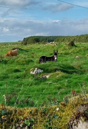 Die Straßen sind meist von Hecken mit Brombeeranken, Efeu, Farnen und Steinmauern gesäumt, so dass es für Fahrradfahrer wenig Ausweichmöglichkeiten gibt. So manches Überholmanövern der von hinten eng vorbeifahrenden Fahrzeuge trieb uns Angstschweiss auf die Stirn. Anderen Fahradfahren begegneten wir nicht, scheint unter diesen Bedingungen hier unbeliebt zu sein. Das Wetter war traumhaft, aber nicht nur die Sonne, sondern auch die zahlreichen Hügel, die sich immer mehr zu Bergen entpuppten, brachten uns zum Schwitzen. Ohne große Pause landeten wir mit hochroten Köpfen gegen 16 Uhr in Ballyvaughan und bestellten uns sehr durstig ein Guinness mit Limo an der Hotelbar. Den jungen Kellner fragten wir gleich nach dem weiteren Weg. Mitleidsvoll sah er uns an, holte noch schnell seinen Kollegen dazu. Die beiden Jungen zeigten mir die serpeninenreiche Straße mit ihren Handys und zweifelte daran, ob man die überhaupt mit dem Fahrrad fahren kann. 14% Steigung!- murmelten sie beeindruckt. Mit Hilfe von Google fand ich dann einen zwar längeren aber moderater ansteigenden Weg über cave aillmee und Westside- ein sehr schöner Weg, sehr einsam. Jedoch war auch diese Strecke sehr schweisstreibend, aber die Stille und Schönheit der Landschaft des kargen Burren entschädigt für einiges. Mittlerweile fiel auch noch mein Akku aus und mit meinem schwerem Leih-ebike ohne Antrieb wurde es