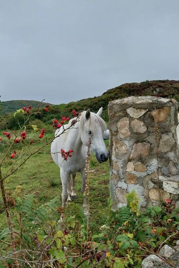 Wir gehen die Treppe im Guesthouse hinab, mit unserem ganzen Gepäck bewegen wir uns über karierten Teppich in rot, rosa, gelb und grünen Farbtönen, sehr irisch. Der Boss des Hauses hilft uns und beschreibt uns den weiteren Weg nach Clifden. Das Aufladen des Gepäckes erfolgt bereits bei Nieselregen, ganz neu für uns Sonnenschein- Verwöhnten.