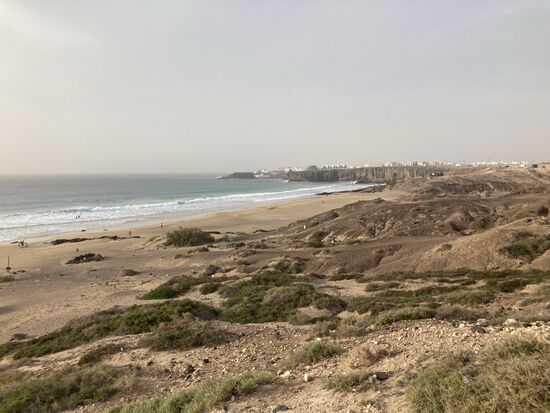 Inzwischen ist der ohnehin schon heftige Wind zu einer echt steifen Brise angezogen. Mit den Fahrrädern ist es kein Vergnügen mehr, dagegen anzukämpfen. Ein kurzer Blick auf die Wetter-App verrät uns, dass es noch heftiger kommen soll. OK, das war's dann wohl. Wir packen unsere sieben Sachen und fahren quer durch die Insel nach Morro Jable zum Hafen im Richtung Gran Canaria. Der Weg führt uns durch die ausgedehnte Trockenlandschaft Fuerteventuras "Staub - Steine - Geröll".