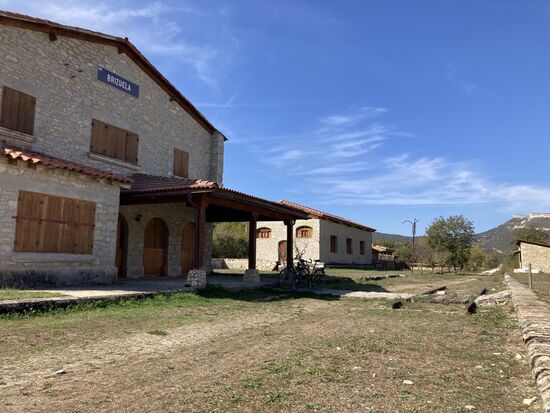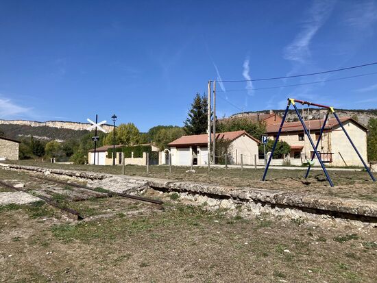 Es handelt sich um eine stillgelegte Bahnlinie, wie wir am alten Bahnhof von Brizuela erkennen. Das Bahnhofsgelände wurde zu einem Kinderspielpatz umgestaltet.