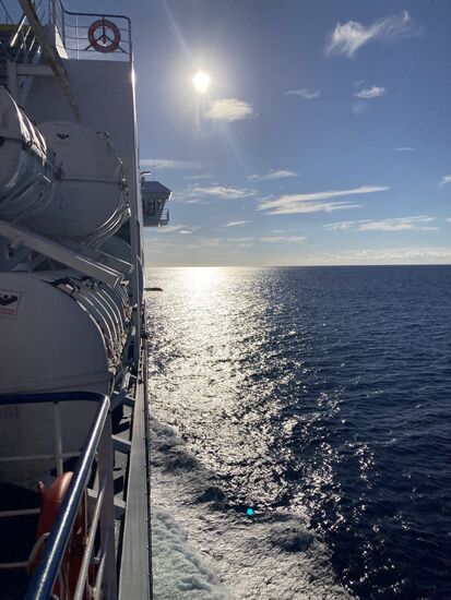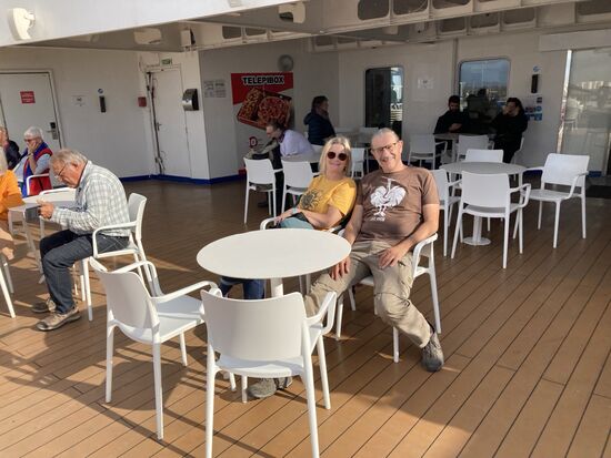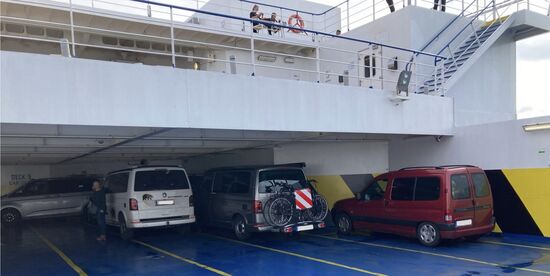 Nun sind wir auf der Fähre. Bulli steht am offenen Deck, schön geschützt unter einem Dach. Somit leider ohne Sonne, so dass kein Solarertrag zu erwarten ist. Wir stellen den Kühlschrank auf eine geringe Kühlleistung, das sollte ausreichen.