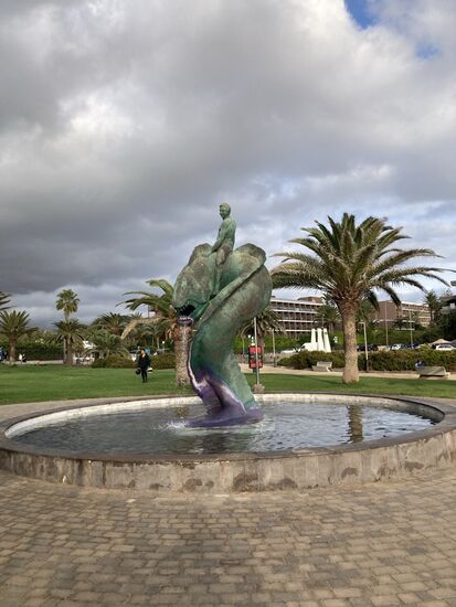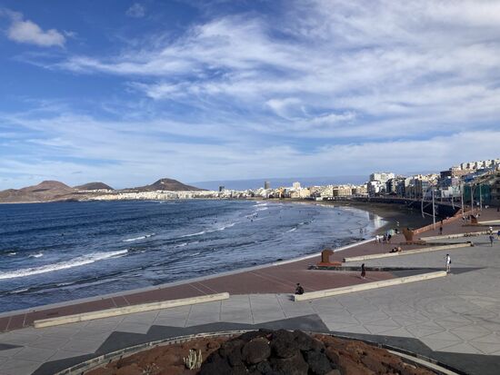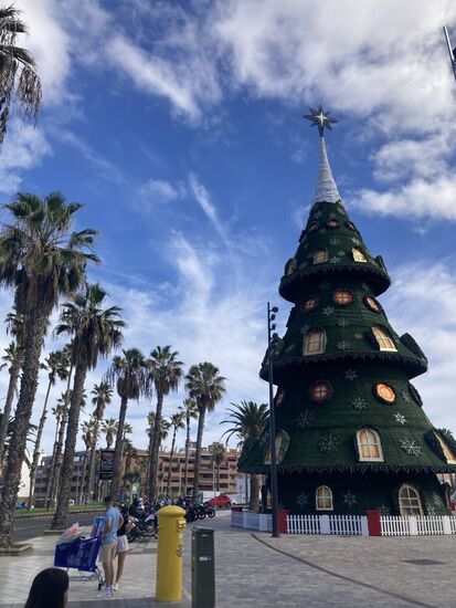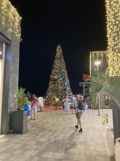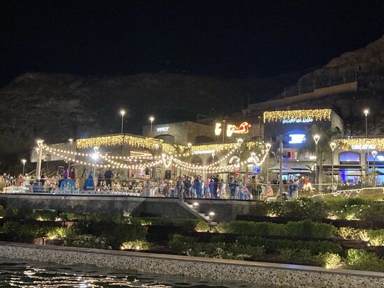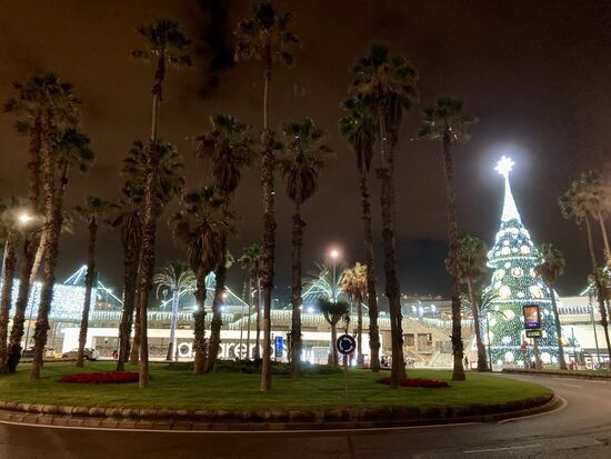 Heute fahren wir in den Norden nach Las Palmas. Wir wollen ein wenig am Strand von Las Canteras flanieren. Hinter dem großen Einkaufszentrum Las Arenas gibt es einen günstigen Bezahlparkplatz. Tagesticket für €3 inclusive 2 Fahrten mit dem Guagua (Linienbus). Der Platz vor dem Einkaufszentrum ist natürlich schon weihnachtlich geschmückt. Besonders schön wirkt er bei Nacht.