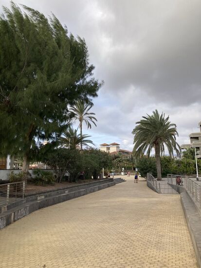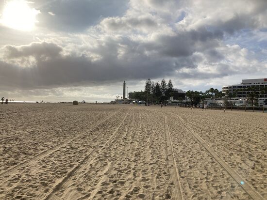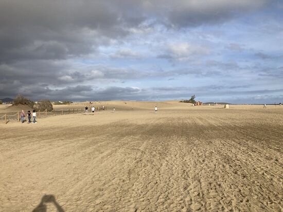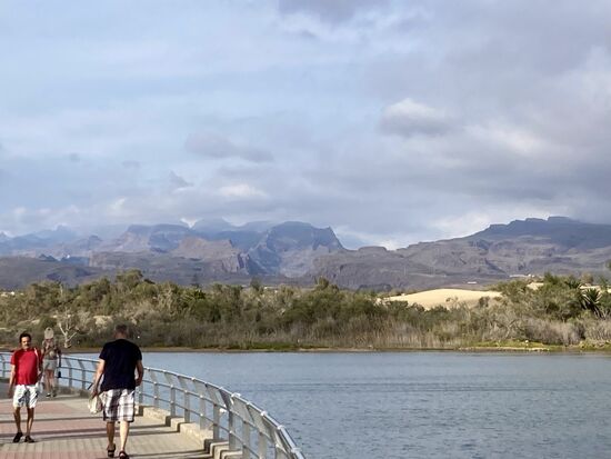 Das Wetter ist zwar trocken, aber dicke Wolken wechseln sich mit der Sonne ab. Ein bisschen ungewohnt für den sonnensicheren Südwesten der Insel. Wir machen uns mit den Fahrrädern auf und fahren zu den Dünen von Maspalomas. Die Landstraße GC500 führt uns entlang der Küste. Eigentlich eine schöne Strecke, welche wir mit dem Auto genießen. Mit dem Auto, aber wir sind mit den Fahrrädern unterwegs. Es geht halt dauernd bergauf und bergab. Ziemlich abgekämpft erreichen wir unser Ziel.