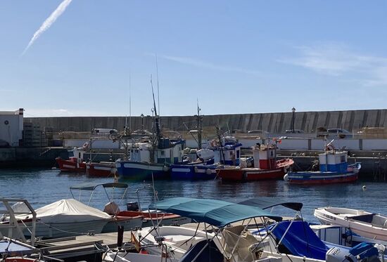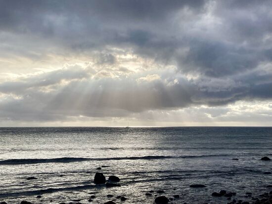 Der Wetterbericht bedroht uns mit Regen und Gewitter, das Wetter ist aber anderer Meinung. Wir sitzen bei angenehmer Abendsonne am Deck und genießen die Wärme der spanischen Wintersonne. Der Sonnenuntergang ist richtig schön, während es im Osten am Horizont regnet.