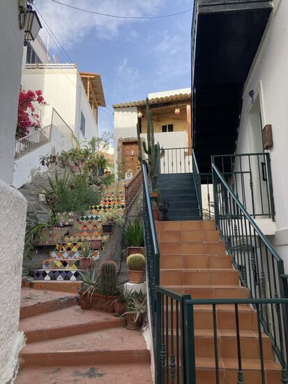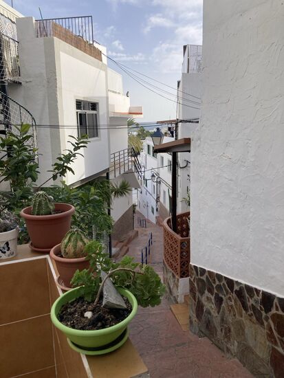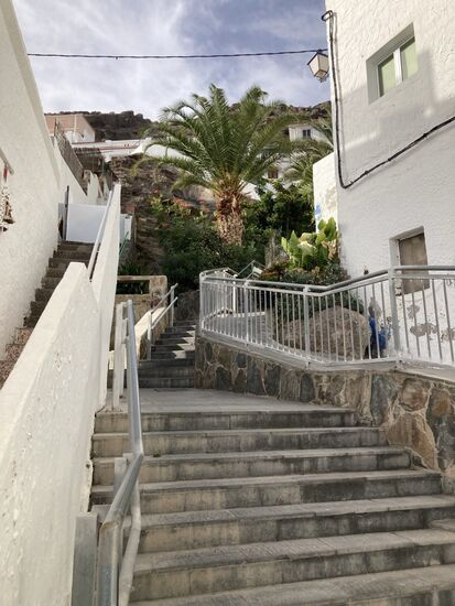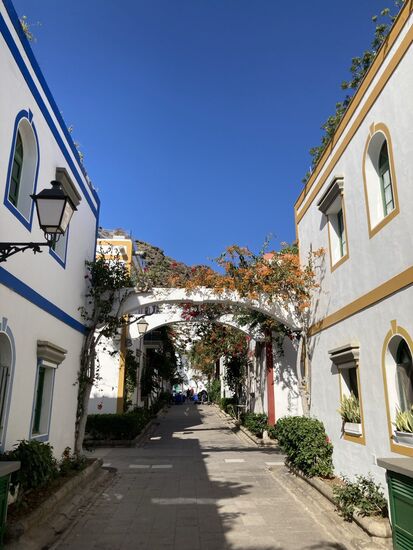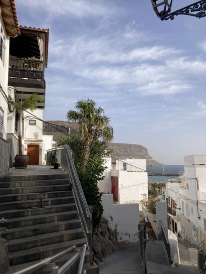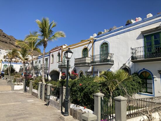 Am Berghang ist die Ansiedlung der einheimischen Bevölkerung. Dort führt ein steiler Weg hinauf zu einem Mirrador (Aussichtspunkt) mit wirklich schönem Blick über den Ort und die Bucht. Ich liebe diese Ortschaft. Manchmal fahre ich nach Einbruch der Dunkelheit nach Pto. Mogan, setzte mich oben am Mirrador und genieße den nächtlichen Anblick von oben.
