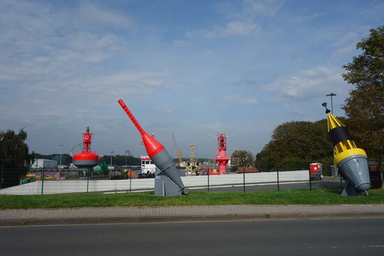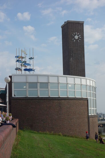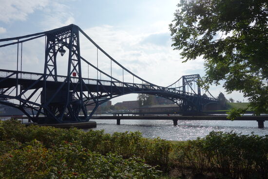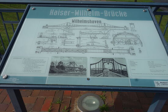 Da wir uns weitgehend auf den Marinehafen bechränken wolle, da Wilhelmshaven eine geplante Stadt und zudem recht weitläufig zwischen einzelnen Sehenswürdigkeiten ist, parken wir in der Nähe der Kaiser-Wilhelm-Brücke, dem Wahrzeichen der Stadt. Mit einer Spannweite von 159,Metern und 440 Tonnen Stahl ist sie Deutschlands größte Drehbrücke. Als sie noch manuell bedient wurde, waren sechs Mann nötig, um die Brücke zu öffnen. Im Volksmund wird sie auch „K-W Brücke" genannt.