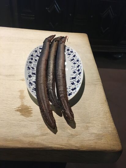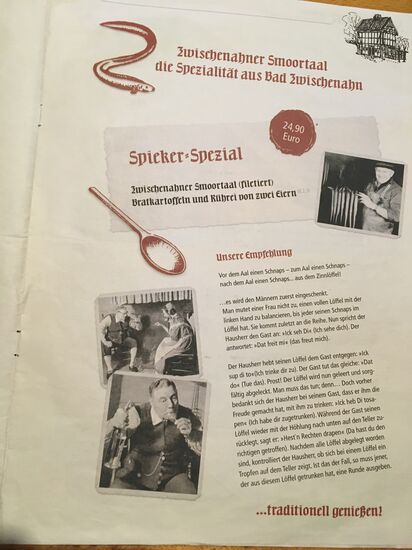 Da es in unserer Gegend keinen Aal zu kaufen gibt, und man ihn auch nicht im Restaurant essen kann, nehmen wir die Gelegenheit wahr und bestellen Aal im Spieker.