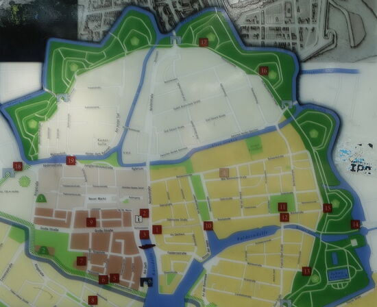 Der heutige Stadtplan von Emden weist aus, dass die Stadt einmal eine Art Festung war. Heute ist der ehemalige Festungswall durch Baumpflanzungen des 17. Jahrhunderts ein weitläufiger Park geworden.