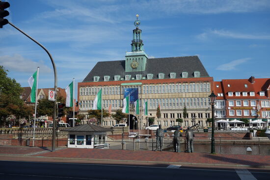 Wir parken am Wall und laufen zu den wenigen als Sehenswürdigkeiten ausgewiesenen Punkten. Da wäre zunächst der repräsentative Bau des Ostfriesischen Landesmuseums, der im 16. Jh. ursprünglich als Rathaus von Emden durch den Antwerpener Stadtbaumeister Laurens van Steenwinkel errichtet wurde.