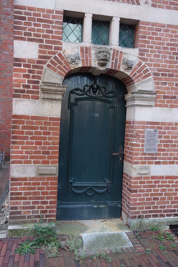 Die Tür entstammt der Zeit des Umbaus um 1800. Die etwas zu weit gehende „Restaurierung" um 1909 hat den ganzen Steinverbund auseinander genommen und die Fassade unter Verwendung alter Steine neu aufgemauert.