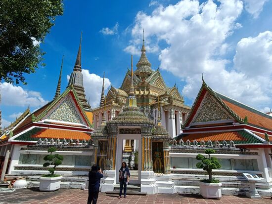 Was zum wiederkehrenden Besichtigungsprogramm bei uns gehören muss - Wat Pho. Wir müssen doch kontrollieren, ob der liegende Buddha noch da ist. Diesmal tatsächlich über den Chayo Praya, schnell und günstig.