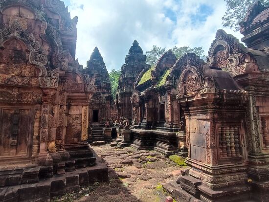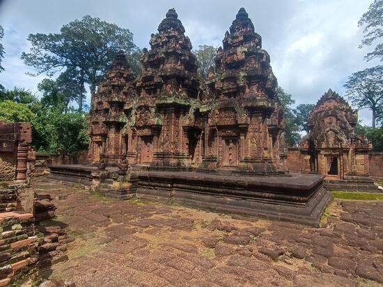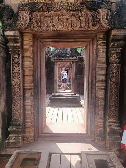 Bantheay Srei, der Frauentempel, viel weiter nordwestlich gelegen, war unser Ziel. Frauentempel genannt wegen des verwendeten rosafarbenen Sandsteins - ein wirklich lohnenswertes Ziel. Durch die Entfernung sind nicht viele Leute da, so dass man das Erleben auch tatsächlich aufsaugen kann.