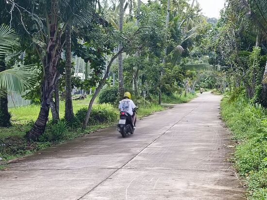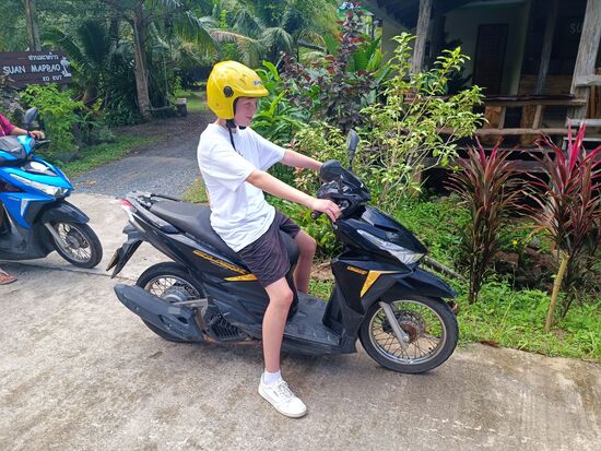 Heute wollen wir mit Motorrollern die Insel unsicher machen. Raphael ist schon ganz heiß drauf und will vor allem auch selbst fahren....von der Gastgeberfamilie eingewiesen prescht er auf einer Nebenstraße davon.