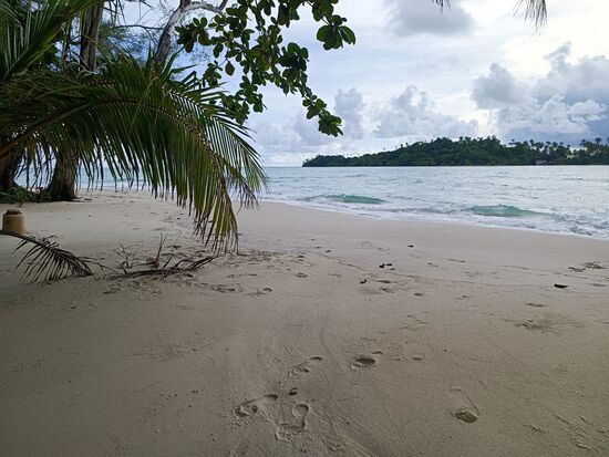 Mittags ein Lunch am Strand. Lecker. Als Nachtisch wurde Ananas serviert auf einem Brett, das war noch so neu, dass noch die Folie drum war...