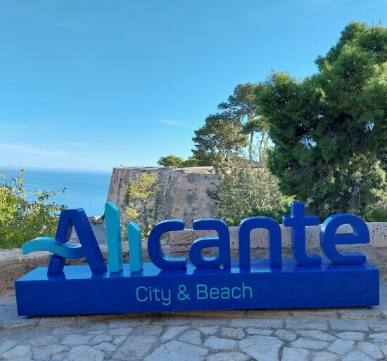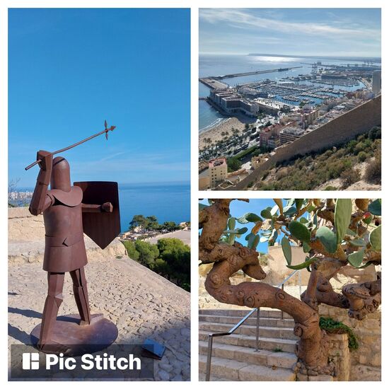 Zur Burg geht's in Alicante vom Stadtstrand (playa postiguet) aus -bequem mit dem Fahrstuhl (2,60€, durch den Tunnel Bild oben links) nach oben- an der Uferstrasse (Bilder unten) steht ein Segelboot vom ocean race (Start war hier im März 2023 in Alicante)- der Mast ist fast so hoch wie das daneben stehende Hochhaus.