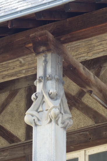 Innerhalb der Barbakane, die den Zugang zum Abas-Tor schützt, wurde ein Fachwerkhaus aus dem 16. Jahrhundert errichtet. Das Obergeschoss ragt über das Erdgeschoss hinaus. Der Vorsprung wird vom Ende der Formbalken getragen. Die Buchten haben ihre alte Tischlerei beibehalten. Eine Statuette der Jungfrau mit Kind schmückt die Fassade im ersten Stock.