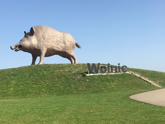 Woinic hat seine Höhle in Bogny-sur-Meuse am 4. August 2008 verlassen. Nach einer außergewöhnlichen, 55 Kilometer langen Fahrt bei 8km/Std durch das Departement der Ardennen hat das größte Wildschwein der Welt am 8. August 2008, Haupttag des Ardenner Festes, Jahrhunderttag für alle Ardenner, den Rastplatz der Ardennen erreicht.