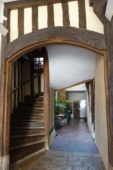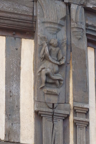 Gegenüber liegt das Maison à Colombages, ein unter Denkmalschutz stehender Fachwerkbau mit einer Fassade interessanter Muster (Pilger und der Heilige Jacques)