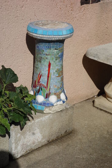 (Es ist ein sehr origineller Garten, den die Künstlerin Hurfane zusammengestellt hat. Seit Jahren gestaltet diese Dame Mosaike um ihr Haus herum und schafft überraschende Welten. Wenn Sie die Jardins de la Feuilleraie betreten, empfängt den Besucher zunächst der rosafarbene Garten: Szenen aus dem Leben auf dem Bauernhof, Motive aus den vier Jahreszeiten des Jahres... Wenn man dann in den blauen Garten übergeht, werden das Meer und das Wetter gefeiert. Inmitten von Mosaikplatten planschen Seerosen in einem Teich).