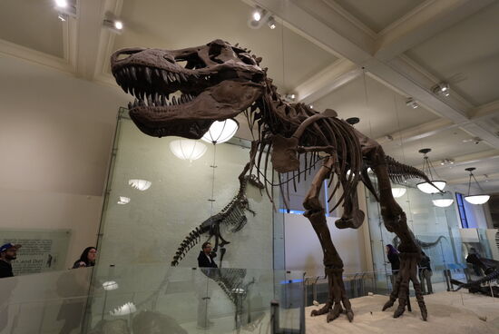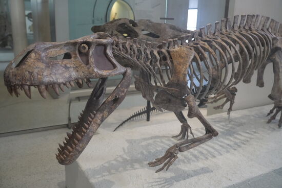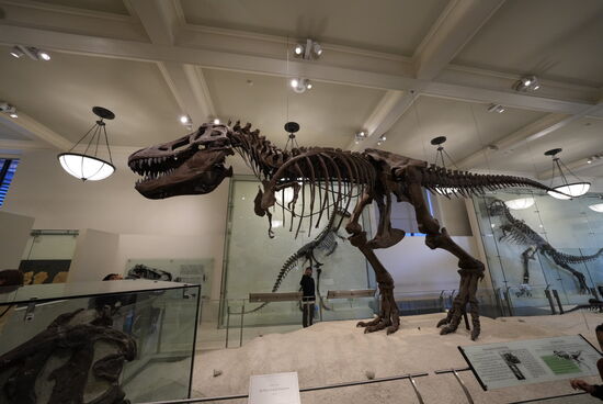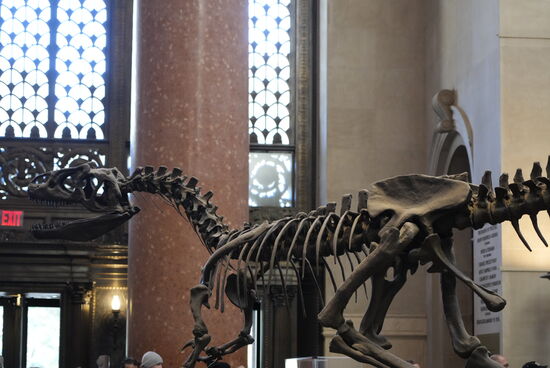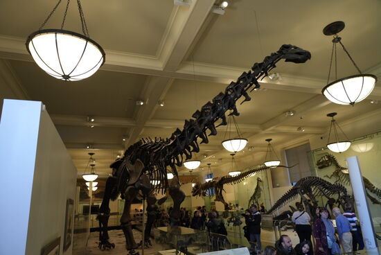 Mein Kindheitstraum : ich habe früher in Büchern gelesen, dass die größten Dinosaurierskelette hier in New York im Museum stehen—dieser ist so groß, dass er durch die Tür „schauen“ muss