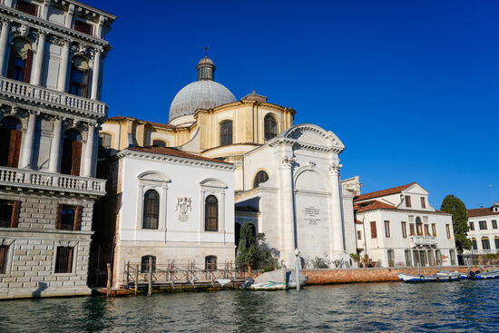 Die "Basilica Santa Maria della Salute" im Morgengrauen. Sie liegt dominant an der Einfahrt zum "Canale Grande". Sie wurde 1631 bis 1687 gebaut und hat innen wie außen einen barocken Baustil.