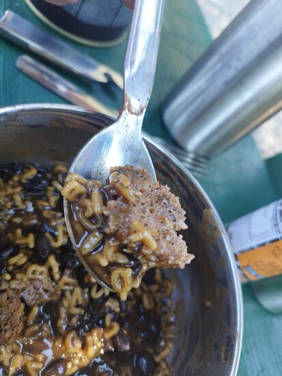 Auch selbst gekocht, schwarze Bohnen in Nudelsuppe mit Brathähnchengewürz und etwas Vollkornbrotstückchen. Kann ich sehr empfehlen, macht super satt, aber, auch mega durstig und fragt nicht, was in der Nacht in unserem Zimmer los war.