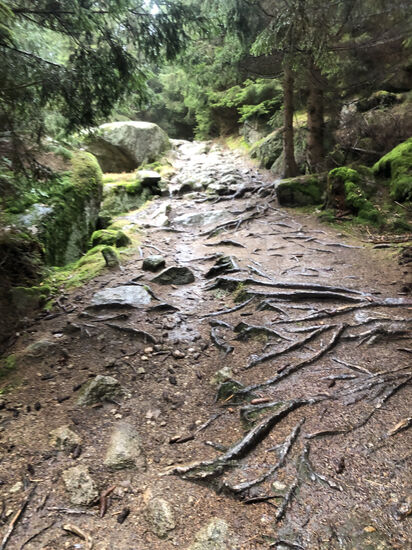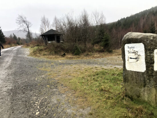 Meine körperliche Verfassung war bis Ende des Heinrich Heine Weges noch ganz gut. Dann kam ich zur "Bremer Schutzhütte". Ab hier regnete es etwas stärker und ich spürte die mittlerweile über 30 hinter mir liegenden Kilometer in den Knochen. Aber dieses Gefühl vergaß ich schnell. Ich zog mir meine Regenjacke an, nahm kurz etwas Energie zu mir und rechnete mir überschlägig aus, wieviel Zeit ich noch bis zur Dunkelheit hatte. Ich ging rechts von der Schutzhütte weiter. Es folgte ein mit schweren Steinen und groben Wurzeln verzierter Weg.