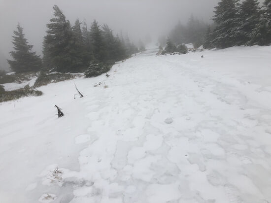 Nach dem grob verzierten Weg kam ich wieder auf einen Besseren. Hier traf ich auf zwei Wanderer die mir entgegenkamen. Sie sagten, dass es noch zirka 4 km bis zum Gipfel sein sollten. Sie warnten mich vor extrem heftigen Wetter auf dem Plateau. Orkan und Schnee sollten mich oben empfangen.
