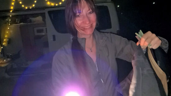 die wenigen Sachen die noch nicht ganz trocken waren nach dem Tumblern und wir keine Lust mehr hatten zu warten beziehungsweise nochmals zu bezahlen, haben wir mitgenommen auf unseren Platz. Hier hat es einige Pfosten auf der Seite, zwischen die wir unsere Wäscheleine spannten und die restlichen Sachen wie Hosen und Sachen die eben nicht getumbleret werden in den Wind zu hängen. Irgendwann im Van hörte ich Wasser laufen resp. rauschen. Ich dachte mir nichts im ersten Moment aber stelle fest, es hört sich an wie ein Rasensprenger. Irgendwann schaute ich dann doch mal draussen nach und sah, dass tatsächlich das Nachbarsfeld bewässert wird. Mehr aus Jux meinte ich zu Harry, ich schau mal, ob der Wasserstrahl nicht unsere zum Trocknen aufgehängte Wäsche trifft. Und tatsächlich, am oberen Ende der Wäscheleine haben unsere frisch gewaschenen Kleider einen Extra-Waschgang erhalten.