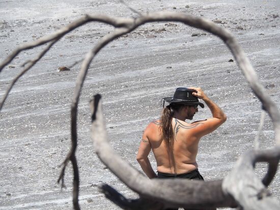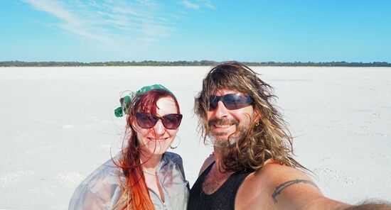 Am Ende des Drives kommen wir zum Pink Lake. Der Salzsee ist aber gar nicht mehr Pink wie auf allen Bildern zu sehen ist. Das hat mit dem Bau der Eisenbahn und des Highways zu tun. Es störte das empfindliche Wassersystem aus mehreren Seen und so gelangte mehr Frischwasser in den See und die Salzkonzentration sank. Dadurch kann das Bakterium, dass die Salzseen rot färbt nicht mehr existieren. Etwas später machen wir nochmals einen Halt, um auf dem See bis zum Wasser zu laufen. Das sind rund 25 min.