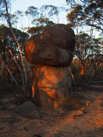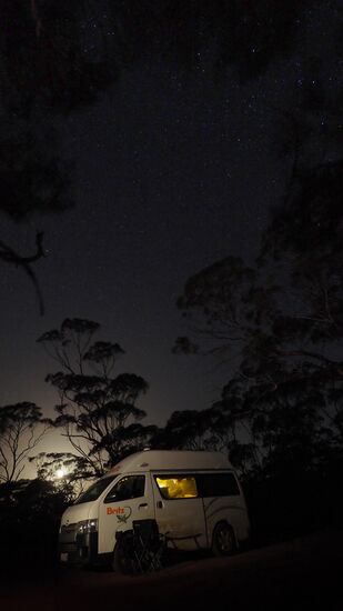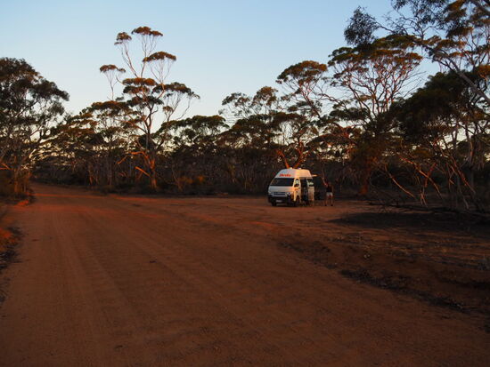 Wieder im Auto, sind wir am überlegen, ob wir bei Sonnenuntergang noch irgendwo essen wollen und dann einen Campground suchen oder ob wir bis Norseman durchfahren. Norseman liegt auch an einem See, hier lässt sich bestimmt ein schönes Plätzli finden für die Nacht. Kurz nach den Fotos auf den Geleisen, sehe ich im Augenwinkel immer eine Bewegung zwischen den Bäumen. Sind das Tiere? So genau kann ich nicht hinschauen, muss ich mich doch auf die Strasse konzentrieren. Die Bäume lichten sich kurz und ich stelle fest, tatsächlich es ist ein ZUG, ein Güterzug. Schade, man kann ihn nirgends genau sehen aber er ist lang, sehr lang. Der nächste Bahnübergang folgt auch schon, das heisst, wir haben den Zug um wenige Minuten verpasst. Der Lastwagen vor uns ist sicherlich froh, dass er gerade nach dem Zug durchfahren kann und nicht anhalten musste, wir hingegegen bedauern, dass wir ihn verpasst haben. Weiter Richtung Norseman bleiben wir unterwegs jedoch an einem Abzweiger hängen. Wir finden einen schönen Platz und richten uns zum Essen ein. Hier in der Wildnis gefällt es uns, so dass wir entscheiden, die Nacht hier zu verbringen. Harry übt sich noch in der Sternenfotographie und bald fallen wir müde in unser Bett.
