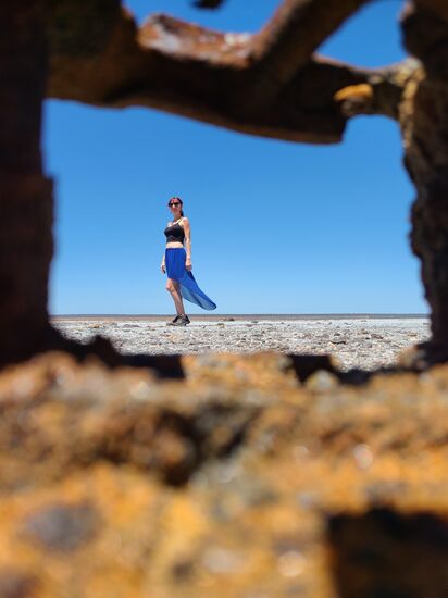 Die Nacht war ruhig, ich habe richtig gut geschlafen daher war ich wohl auch schon vor 8 Uhr putz munter. Frisch machen, schön schminken - auch wenn wir mit dem Campervan unterwegs sind, gehören ein paar Rituale wie schminken und abends wieder abschminken und mein Gesicht massieren dazu. Harry fliegt unterdessen mit der Drohne eine erste Runde und anschliessend geniessen wir unser Frühstück. Unser Nachtlager war unweit der 550 Milionen Jahre alten Dundas Rocks, welche bei Tageslicht nun besser sichtbar sind, als in der gestrigen Abenddämmerung. Bald sind wir im Nullarbor und kommen dann nach South Australia - somit unterliegen wir bei der Durchfahrt den Quarantänebestimmungen und dürfen nicht einfach alles mitbringen was wir wollen. Honig zum Beispiel schon mal nicht, alles andere muss ich noch herausfinden aber in meinem schlauen Reisebuch habe ich einen Link gefunden, der das wunderbar erklärt. Zuerst fahren wir aber noch ein paar Kilometer weiter in den Bush, hier gibt es letzte Überreste einer ehemaligen Stadt - die Stadt Dundas, die zu Goldrauschzeiten florierte. Viel ist nicht übrig geblieben, ein wenig Schrott, ein paar Strassenschilder und neue Hinweistafeln über die Geschichte. Angeblich gibt es auf einer Salzseeinsel ein einsames Grab, dass Lone Grave, mal sehen, ob wir es ohne Karte finden. Der Lake Dundas ist riesig, noch viel grösser als der Pink Lake bei Esperance. Heute ist es heiss, was ich in den letzten Tagen trotz Sonnenschein gefroren habe, schwitze ich nun aus allen Poren. Das Termometer zeigt schon um 10 Uhr morgens 27° an. Ein Blick auf mein Handy verrät, diese Woche wird über 42° hier. Wir huschen von Baum zu Baum, am Horizont auf dem See flimmert die Hitze. Ein bisschen klettern und Steine inspizieren, dann sind wir am Ufer und finden auch tatsächlich weitere Hinweisschilder zum Lone Grave. Wir wandern am Seeufer und dann quer über einen Ausläufer auf ein Inselstück und finden versteckt unter einem Baum das uralte Grab. Ein siebenmonatiges Baby wurde hier 1897 vergraben. Gleichzeitig ist dies der einzige Beweis, dass hier tatsächlich Menschen lebten.
