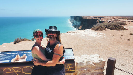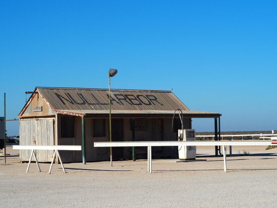 Wieder auf dem Highway habe ich noch einen Hinweis zu einem Cave mit Handspuren aus früheren Zeiten gefunden. Das wäre mal noch was. Wir suchen den Weg und stellen fest, dass man zu dieser Höhle ein Stück über den alten Eyre-Hwy etwas versetzt im Landesinneren fährt. Schon der Abzweiger verheisst nichts Gutes, da es bereits ab hier eine unbefestigte Strasse ist. Wir fahren ein Stück, rechnen aus wie weit es bis zum Abzweiger des alten Hwy ist und entschliessen, nicht zu fahren, da wir keine Ahnung haben, ob diese dann einigermassen befestigt ist oder nicht. So halten wir uns auch an die Reglen, die die Vermietung festgelegt hat betreffend KM auf unbefestigten Strassen. Dafür zieht Harry sein mitgebrachtes Bühnen Outfit an und wir drehen ein paar Video-Sequenzen für einen neuen Hit von Smoke'n'Flame. Seid gespannt! Die Kulisse ist schon mal grandios. Anschliessend geht es weiter Richtung Yatala, wir wollen ja noch den Zeltplatz erreichen. Die Fahrt führt uns durch die Landschaft und wir können uns eigenlich nicht satt sehen. Bei Nullarbor-Roadhouse legen wir kurz eine Pause ein, da es hier einen grossen Truckstop hat und wir einerseits seit langem mal wieder etwas Empfang haben und Harry etwas hochladen möchte und ich muss noch ein Bisi- und Fotostop machen, sieht super aus hier im Nirgendwo diese Raststätte. Kaum da, gibt es natürlich auch Interessantes über die Gegend zu lesen und ich werde schnell in ein Gespräch verwickelt, so dass ich glatt vergesse, Harry zu sagen, dass es in den Toiletten auch Duschen hat, die mit Coins funktionieren. Denn eigentlich haben wir nur einen Campingplatz herausgesucht, das wir gerne mal wieder duschen wollten.