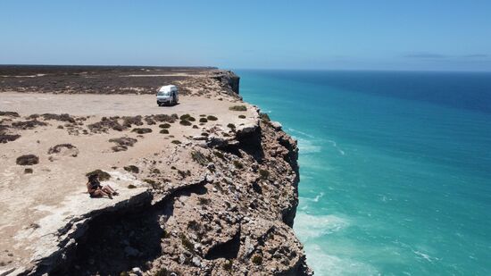 Der nächtliche Schlafplatz ist schnell leer, es waren noch zwei andere Fahrzeuge da als wir ankamen und wir sind wieder alleine. Gemütlich frühstücken wir, da fährt doch tatsächlich ein Auto keine 3 Meter neben uns zwischen den Büschen und unserem Van hindurch und parkt hier. Genau hier! Ist ja nicht so, dass der riesige Platz noch eine andere Möglichkeit gehabt hätte, zumal Harry eigentlich hinter dem Bus ein Bisi machen wollte. Das ging nun nicht mehr. Zwei ältere Damen stiegen aus dem Auto und feierten den Ausblick als gäbe es kein Morgen. Herrlich mitanzusehen. Eigentlich haben sie ja recht so schnell wie sie dann da waren, waren sie dann auch wieder weg. Wir fahren nach dem Frühstück an unsern eigentlich angedachten Schlafplatz und fliegen mit der Drohne. Die Klippen sind schon sehr beeindruckend und das Meer in seinen verschiedenen Blautönen ist einfach bis zum Horizont grandios.