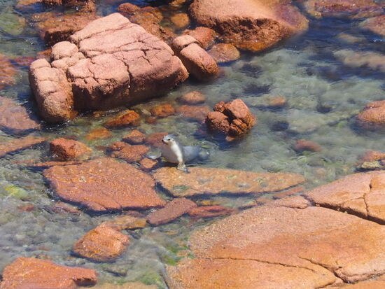 In der Wrighty's Bayview hat uns Harry ein Plätzchen auserkoren, an dem wir nun nach dem Entsanden und putzen auch noch in Ruhe etwas essen konnten. Allerdings ist heute schon sehr windig und irgendwie nervt mich der Wind: im Teller ist Sand, am Besteck ist Sand... wenn Sandra an den Strand geht, hat sie San-d-ra wir essen den Sand also wortwörtlich mit. Wir entschliessen uns obwohl es hier total schön und einsam ist, nach dem heutigen Einkauf doch weiter zu fahren. Nach unserem spartanischen Frühstück mit dem letzten Bütterchen packen wir zusammen und fahren erst nach Point Labatt, eine Empfehlung von Kurt und Conny, hier gibt es eine Seelöwen-Kolonie. Tatsächlich lassen sich nach genauerem Hinsehen ein paar Tiere erkennen. Und wer geduldig ist, kann sie auch noch beim Spielen beobachten.