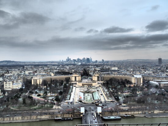 Gut geschlafen und frisch gings am nächsten Morgen voller Tatendrang wieder los. Das Gepäck konnten wir im Hotel einlagern bis zur Rückreise an den Flughafen, das machte vieles einfacher. Um 12 Uhr haben wir den Lift auf den Tour d'Eiffel gebucht. Vorher reichte es für das Frühstück und ein gemütliches Spazieren zum Turm. Ich friere schon wieder. In der Nacht wurde Paris von einer feinen Schneeeisdecke zugezuckert. Es weht ein so eisiger Wind, dass sich die 0 Grad noch viel kälter anfühlen. Ich wickle meinen Paschminaschal von Doro um den Kopf und um den Hals, so dass ich mich richtig darin verstecken kann, es sieht schon fast so aus, als käme ich aus dem fernen Osten. Nun gut, anstehen für den Lift, einsteigen und hoch gehts. Leider ist das Top wegen Bauarbeiten geschlossen, wir müssen also in der zweiten Etage aussteigen. Im Vorraum ist es noch einigermassen windgeschützt und warm aber kaum tritt mann auf die äussere Plattform, fühlt es sich an, wie eine Erbse die schockgefroren wird. Die Empfangsdame im Hotel meinte, sie hätten schon seit langem nicht mehr so kalt gehabt. Na bravo, natürlich wenn wir in nicht ganz so typischer Winterkleidung hier sind schon "grr!". Als wir gestern ein Bild vom beleuchteten Eifelturm auf Instagram hochluden, hat sich ein Paar aus New York gemeldet, dass sie ab Mittwoch ebenfalls in Paris sind. Wir haben sie auf unserer Reise auf Fuerteventura kennengelernt und sind seither über Socialmedia ab und zu im Austausch. Leider verpassen wir uns so wegen einem Tag, da wir ja bereits am Dienstagabend weiterfliegen. Schade, das wäre ja witzig gewesen.Nun, Paris mit einem Zuckerguss in grau, weiss, schwarz wirkt fast wie aus einer anderen Zeit. Die Rundumsicht ist einigermassen klar, es ist wolkig aber nicht vollständig trüb. Um mich aufzuwärmen, verzog ich mich zwischendurch in den Souveniershop und hatte schon ein schlechtes Gewissen, weil ich nichts kaufte. Ist aber auch alles viel zu teuer. Als Harry dann ebenfalls kommt, erzählt er mir, dass seine Mami ihn bat, einen kleinen Eifelturm mitzubringen. Ok, ein Vorwand um etwas zu kaufen. Wenigstens ist er tatsächlich und wahrhaftig auf dem Eifelturm gekauft worden. Um zu schreiben, hab ich mir noch ein Bleistift gekauft. Noch eine Runde in der Kälte, ein paar Fotos und dann bin ich froh, wieder mit dem Aufzug nach unten zu dürfen, da ist es wenigstens warm. Ich erinnere mich, als ich das letzte Mal in Paris auf dem Eifelturm war, war es Sommer und warm. Der Vorteil im Winter ist auch, dass die Blätter der zwar schönen Bäume die Sicht nicht verdecken. Auch war vor etwas mehr als 10 Jahren noch nicht alles eingezäunt und mit Sicherheitskontrollen versehen. Schade, so kann mann nur noch unter den Turm, wenn man ein Ticket hat oder eins kaufen möchte.
