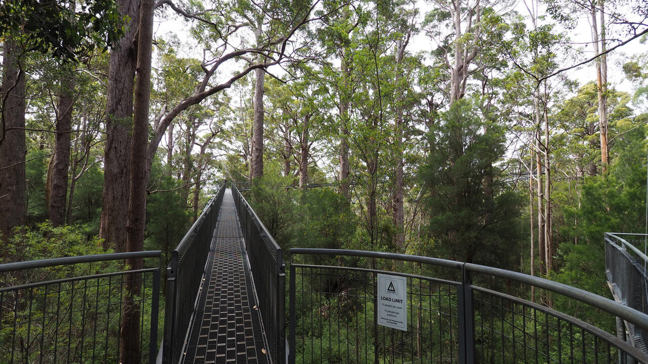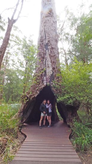 Heute sind wir nach einer Nacht in Northcliffe Bush Camp (mit Strom) weiter gefahren zu den grossen Karri-Bäumen. Hier gibt es den Treetop Walk im Valley of the Giants. Vom Parkplatz aus geht es natürlich an einem Eintrittsschalter mit Souveniershop vorbei in Richtung Eingang. Eine nette Dame locht das Eintrittsticket und los gehts von den Wurzeln in die Wipfel. Die hängende Konstruktion ist so gebaut, dass sie mit Wind und Bewegung durch die Menschen mitschwingt und damit den wippenden Baumästen nicht in die Quere kommt und diese abbrechen. Faszinierend. Wir steigen also hoch bis auf 40m Höhe und die Baumwipfel sind immer noch über uns. Die Bäume werden bis 70 Meter hoch und ganz alt. Sie haben aber ein sehr empfindliches Wurrzelwerk unter anderem darum, hat man den Walk gebaut, um sie zu schützen. Nach diesem Erlebnis kann man noch die verschiedensten Bäume auf dem Tingeltrail bewundern und teilweise sogar in ihre ausgehölten oder ausgebranten Baumstämme hineinstehen und ein Foto schiessen.