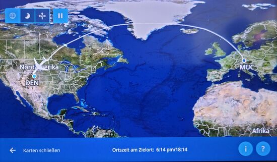 Dachten wir! Pünktlich um 16.05 h gings in die Luft und das Richtung Norden. Wir überflogen Bremen, Helgoland, die Färöer Inseln. Nach Island zwischen Isafjördur (Island) und Ittoqqortoormiit (Grönland) (wers kennt?) gings dann über das Eis des südlichen Zipfels Grönlands und weiter über das Eismeer nach Kanada. Wir überflogen den Hudson Bay, North- und South Dakota und landeten endlich nach 10 1/2 Std. in Denver. Ein James Brown saß als Kapitän im Cockpit und flog mit uns diesen Bogen über den Atlantik.