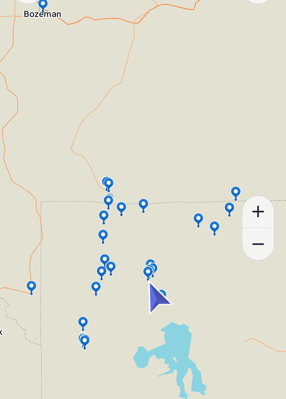 Hier sind die Markierungen wo wir überall waren—wir fahren abends die 125km nach Bozemann zurück
