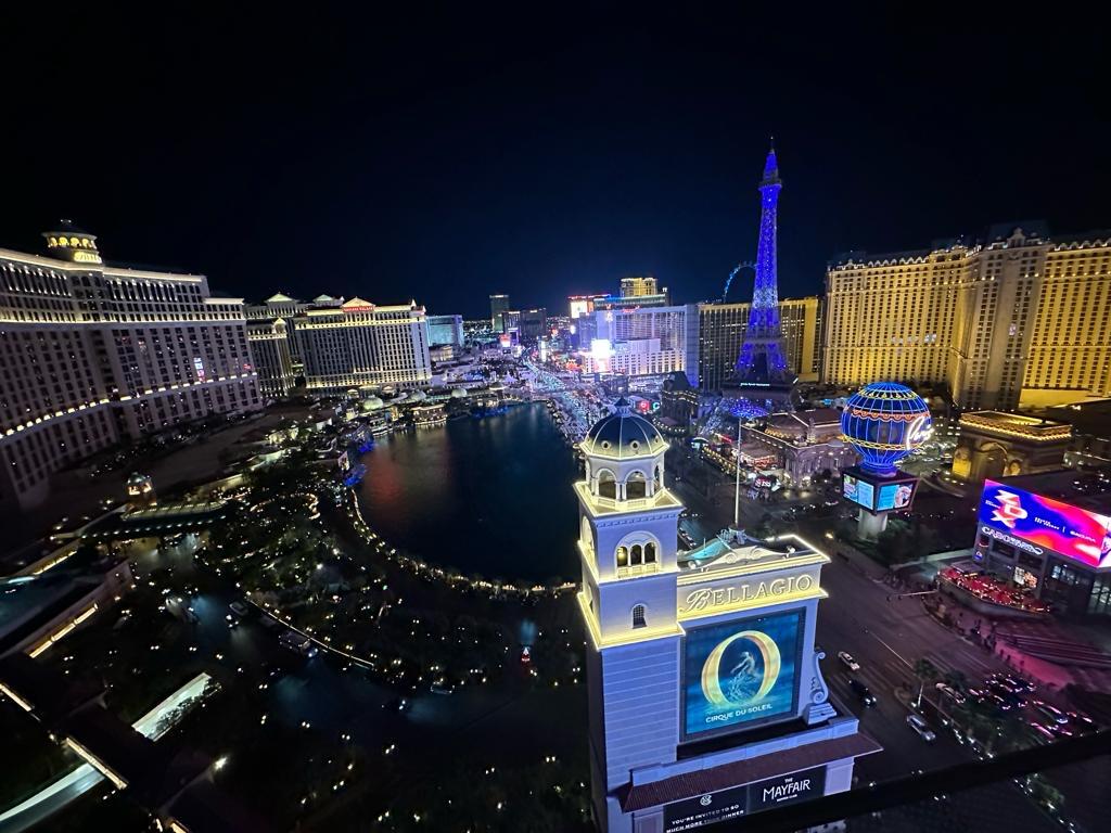 Blick am Abend von unserem Balkon im 30. Stockwerk des Hotels. Links das berühmte Bellagio Hotel; bekannt aus „Ocean 11“. Dahinter „Cesars Palace“ , rechts „Paris, Paris“, etc. - Las Vegas im Schein der Lichter.
