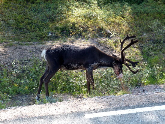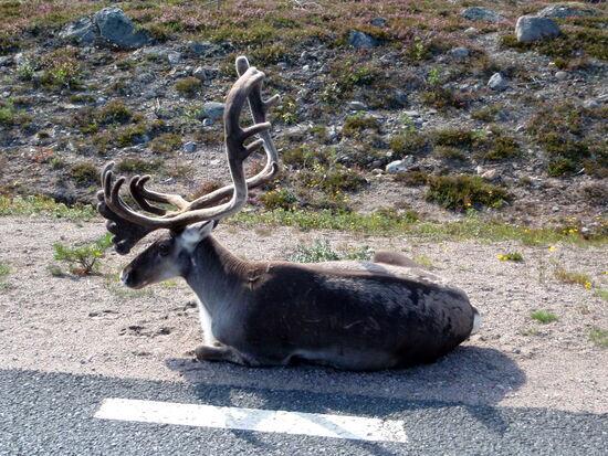 So fuhren wir wieder die lange und beschwerliche Straße am seenartig verbreiterten Luleälven entlang. Als wir die E45 erreichten, bogen wir nach Süden ab. Hinter Porjus machten wir Kafferast am Harsprångsfallet. Wir hatten uns das Gelände ja schon auf der Hinfahrt angesehen. So gingen Carsten und Sabine alleine los, während wir Kaffe kochten und sich Christa etwas ausruhen konnte. Auf der Weiterfahrt trafen wir mehrfach Rentiere auf der Straße. Im Norden muß man immer sehr aufmerksam fahren, da die Tiere ziemlich unberechenbar sind.